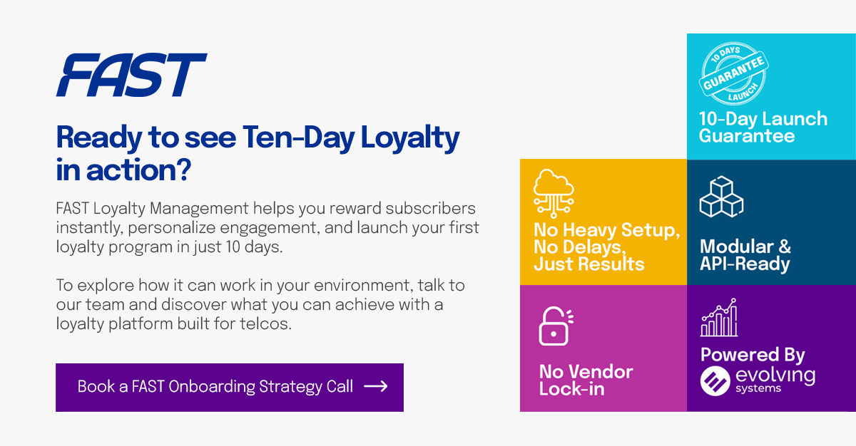 Telcos know they need to move beyond short‑term discounts, but turning loyalty ideas into a live, measurable program is often slow, complex, and tightly bound to legacy stacks that are hard to change. FAST Loyalty Management is built for this challenge: it empowers teams to reward, retain, and engage subscribers with personalized, data‑driven loyalty programs that deliver measurable results. With “no delays, no infrastructure setup, no guesswork,” operators can use FAST to launch their first loyalty program in 10 days and then scale it as loyalty ambitions grow.
